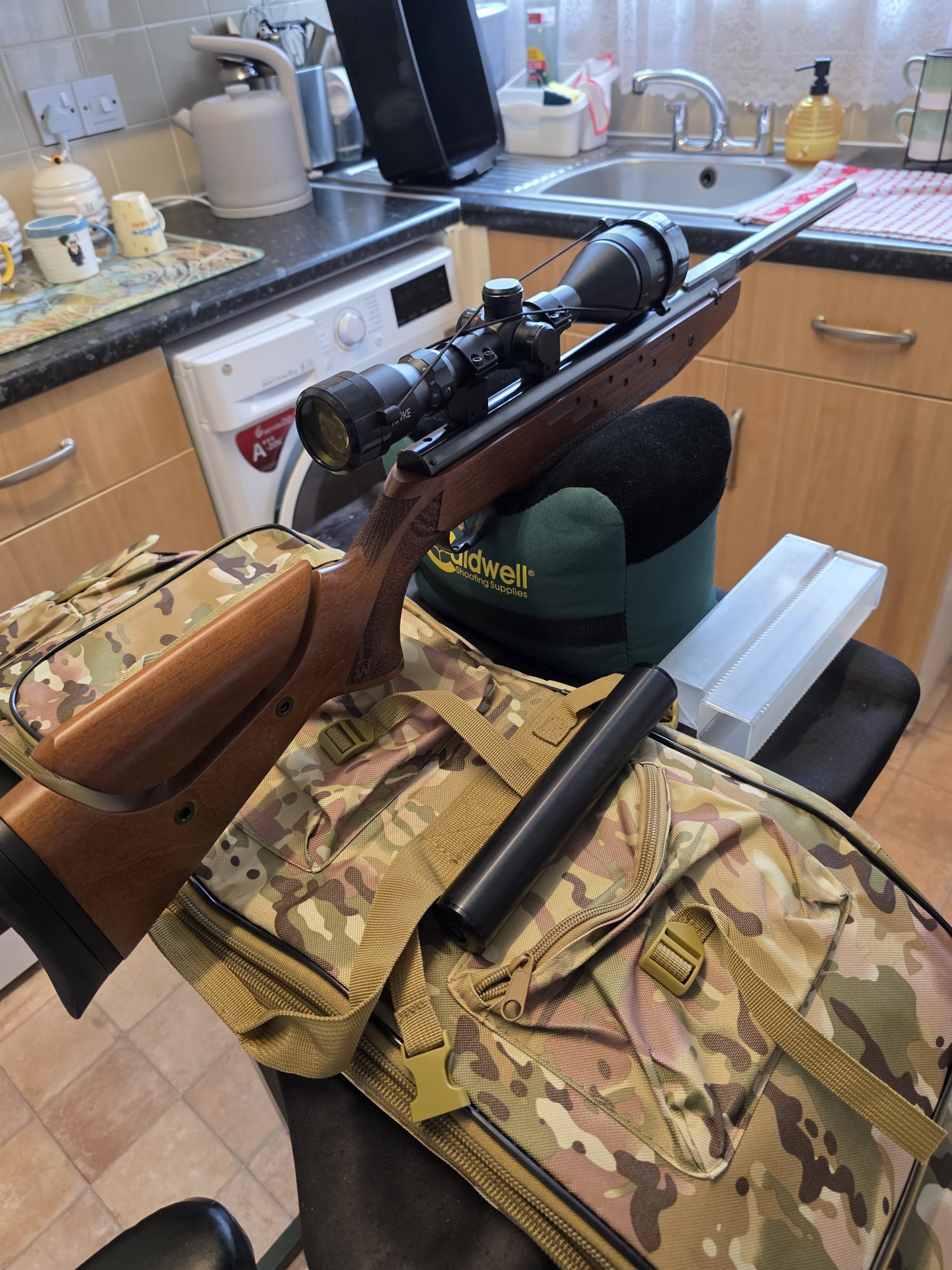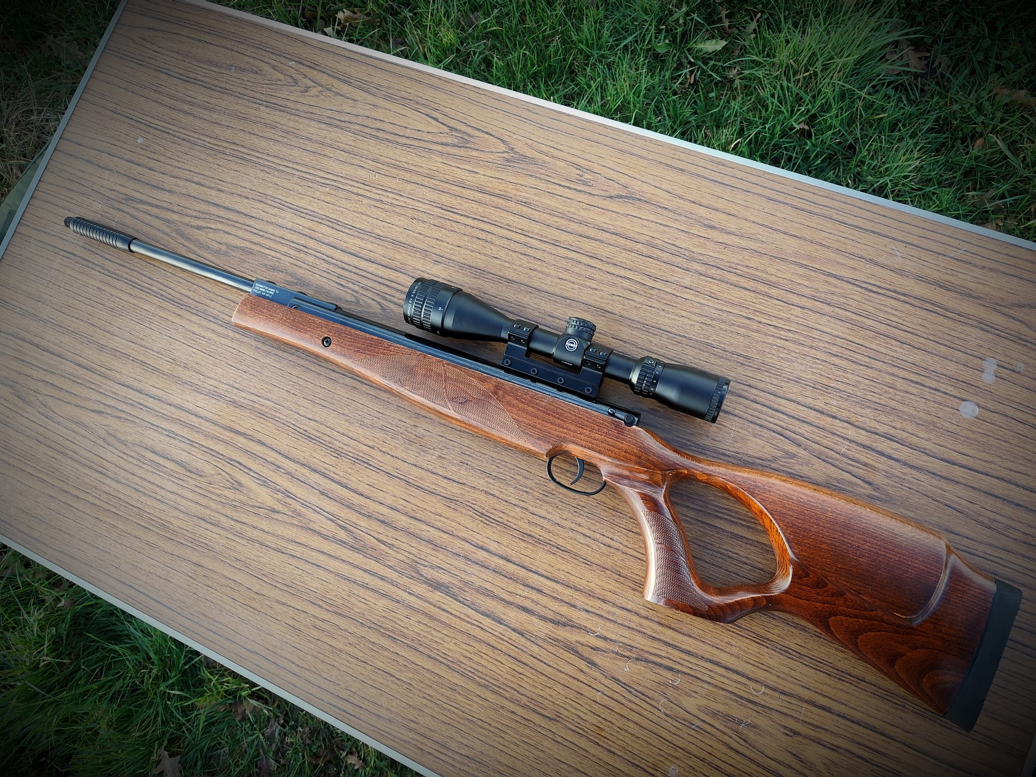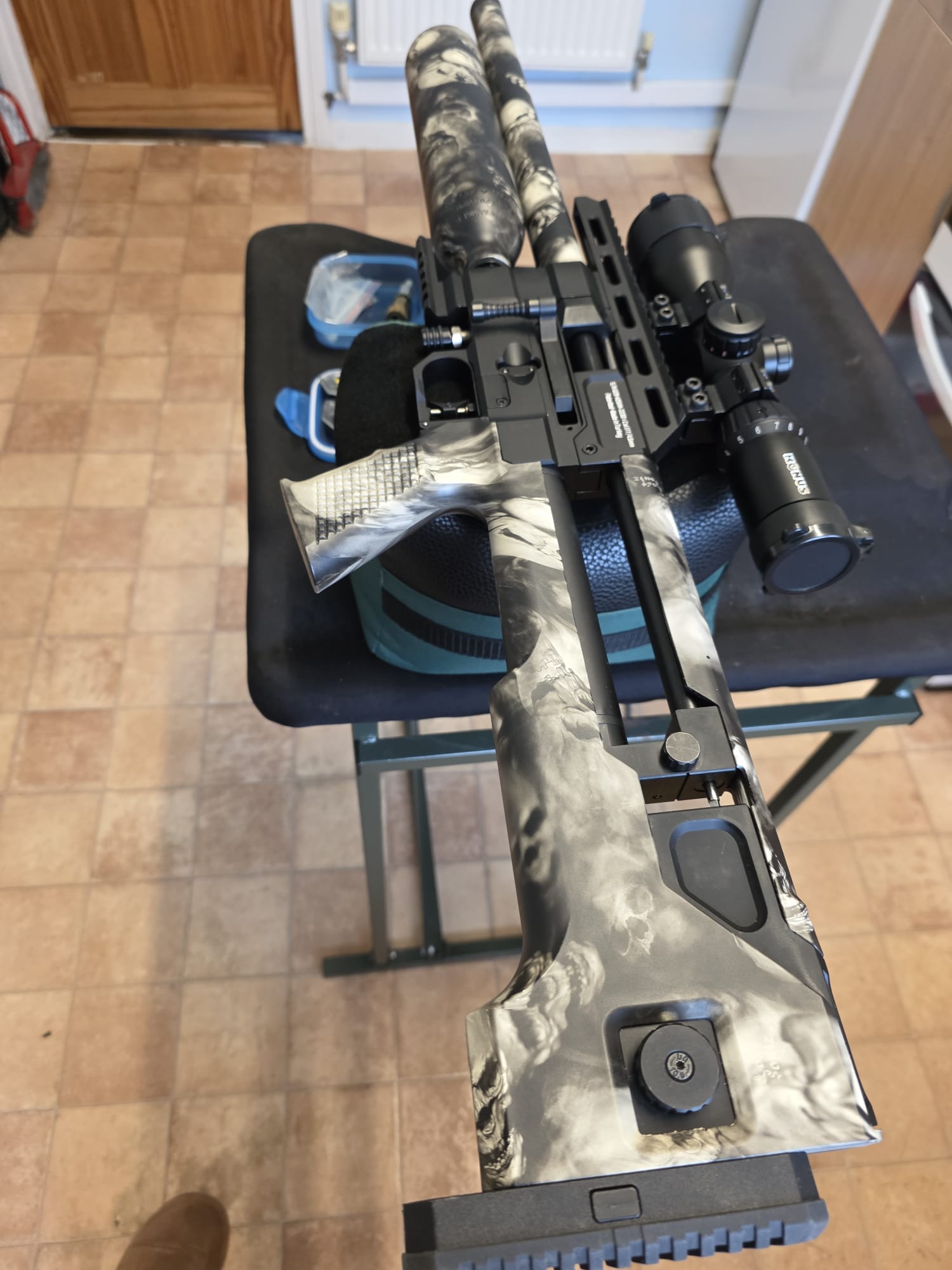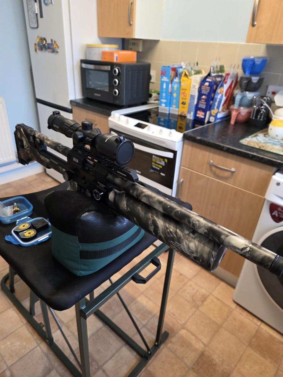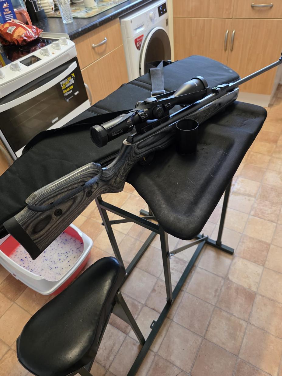 The rifle is in excellent condition with only a couple of very light marks to the seriously eye catching stock. The rifle has been tuned and features an incredibly fast lock time with minimal twang and recoil. The hideous plastic moderator has also been removed and instead features a metal 1/2UNF thread adaptor instead.