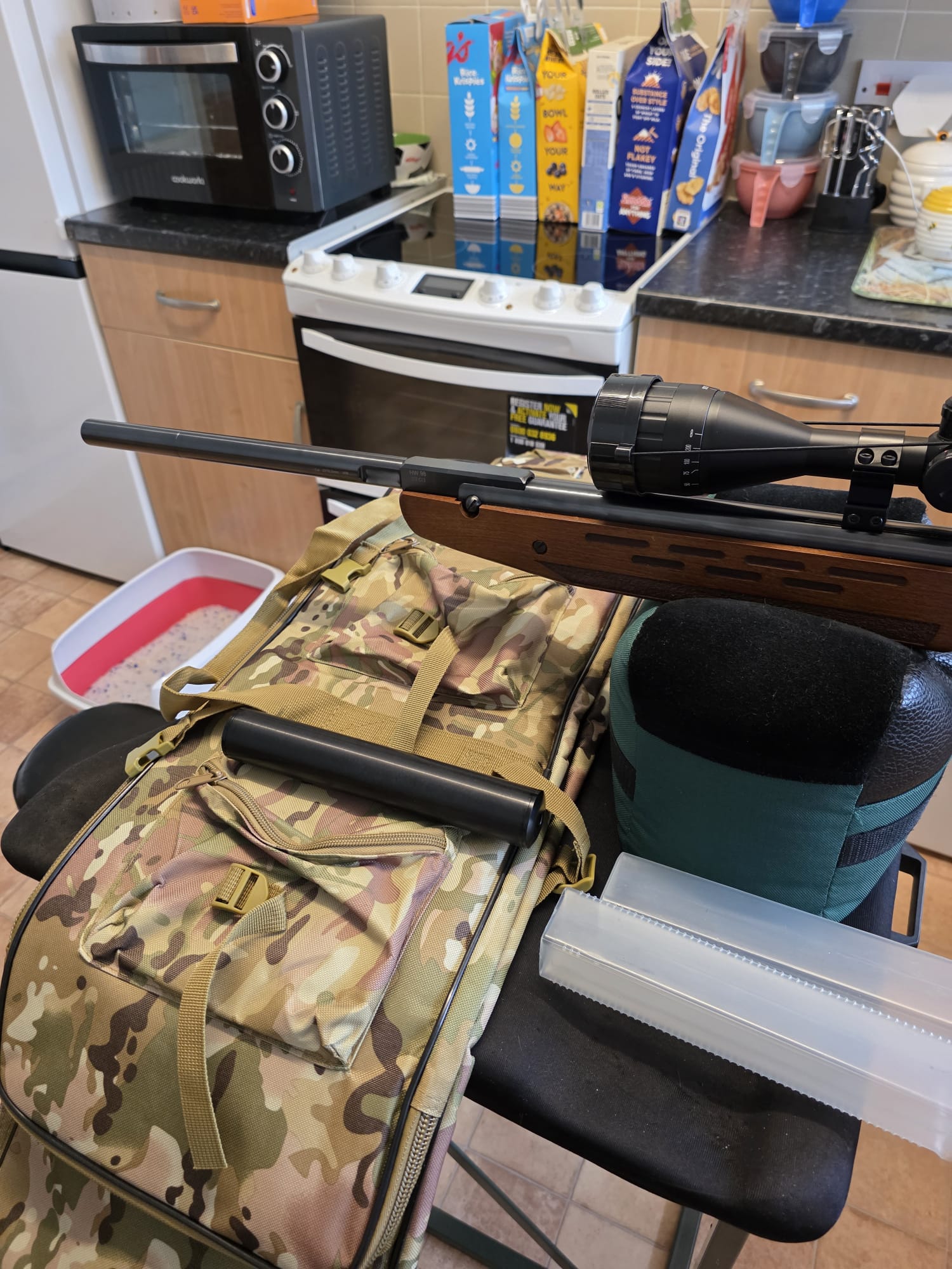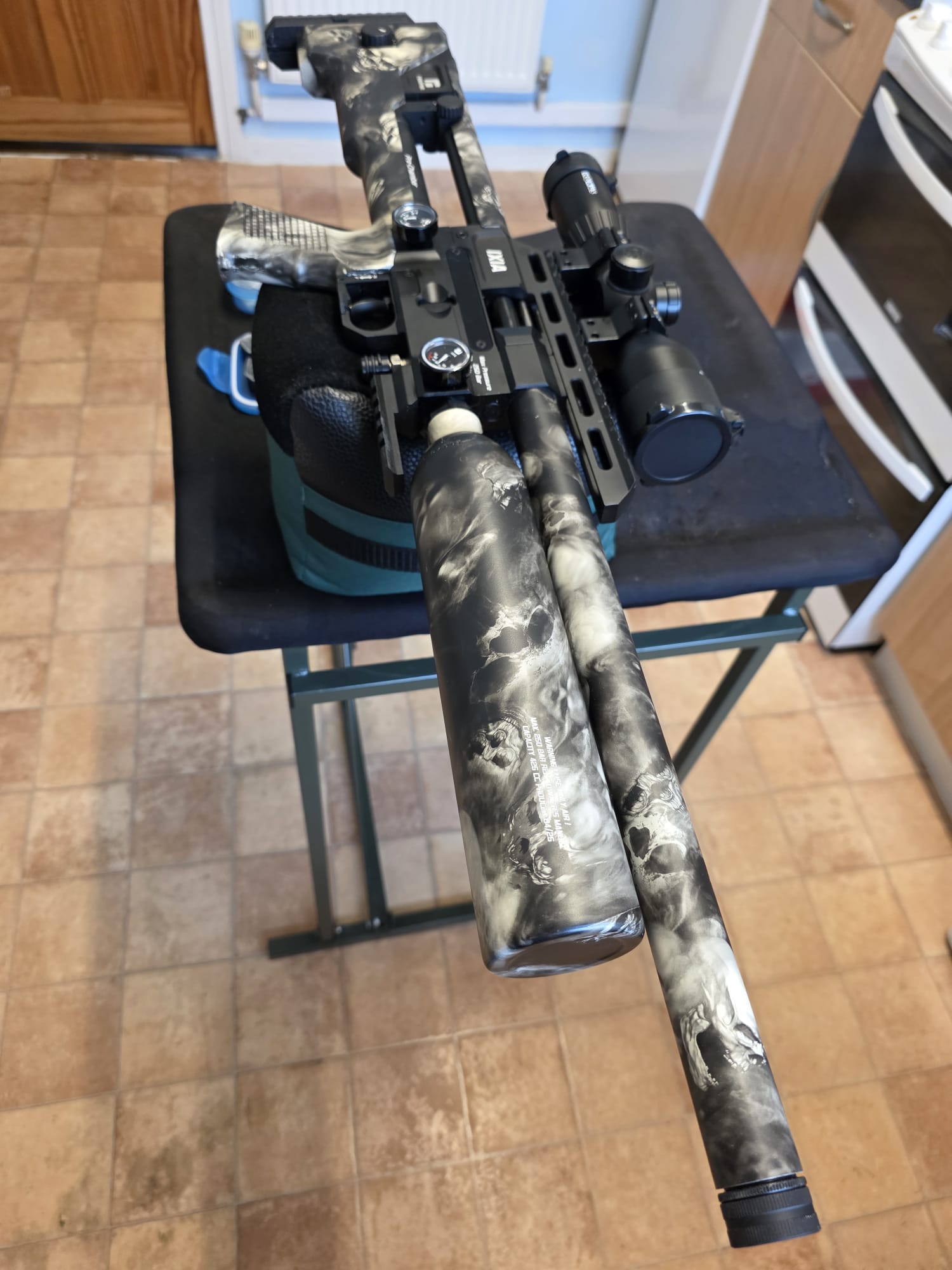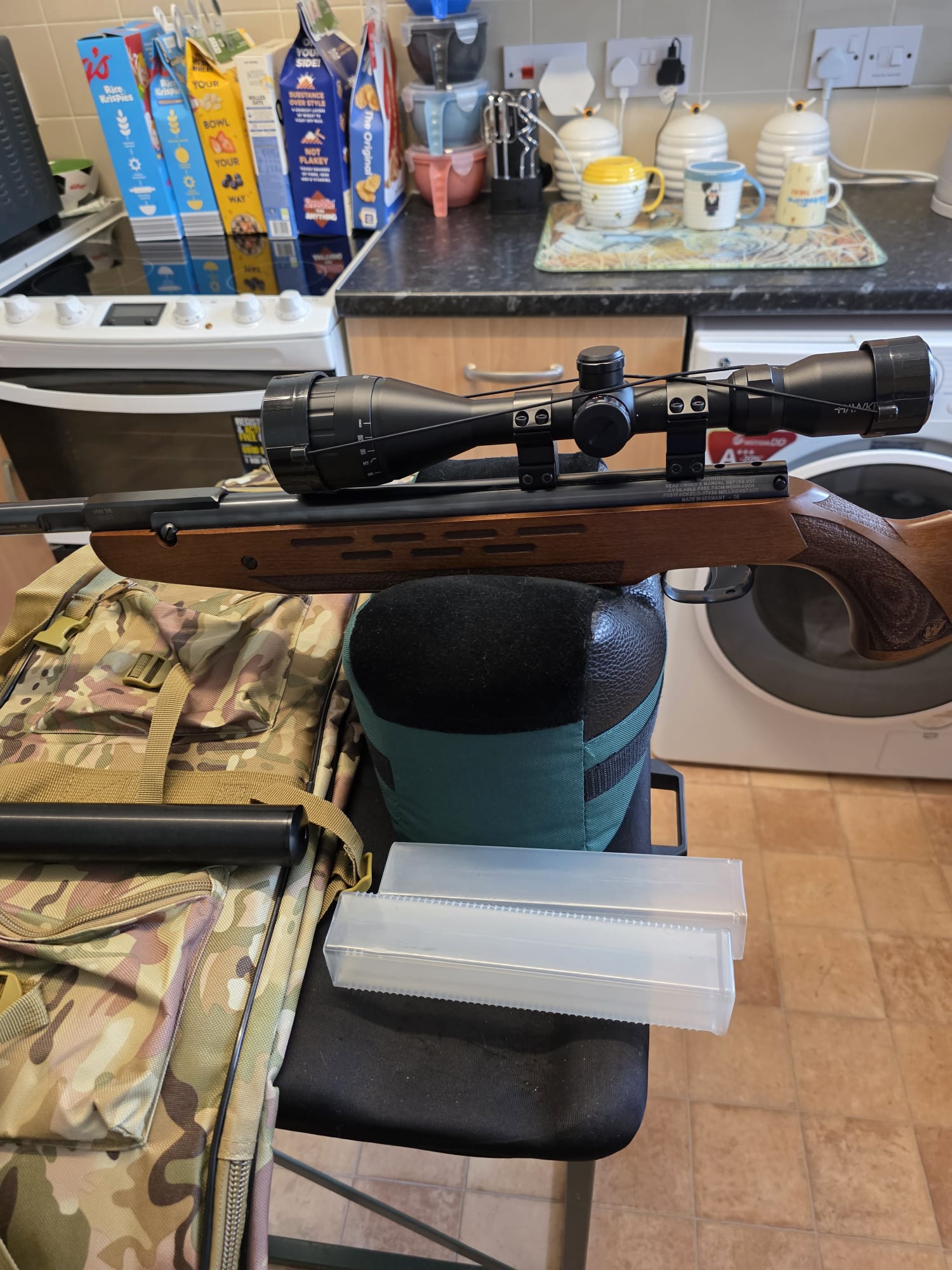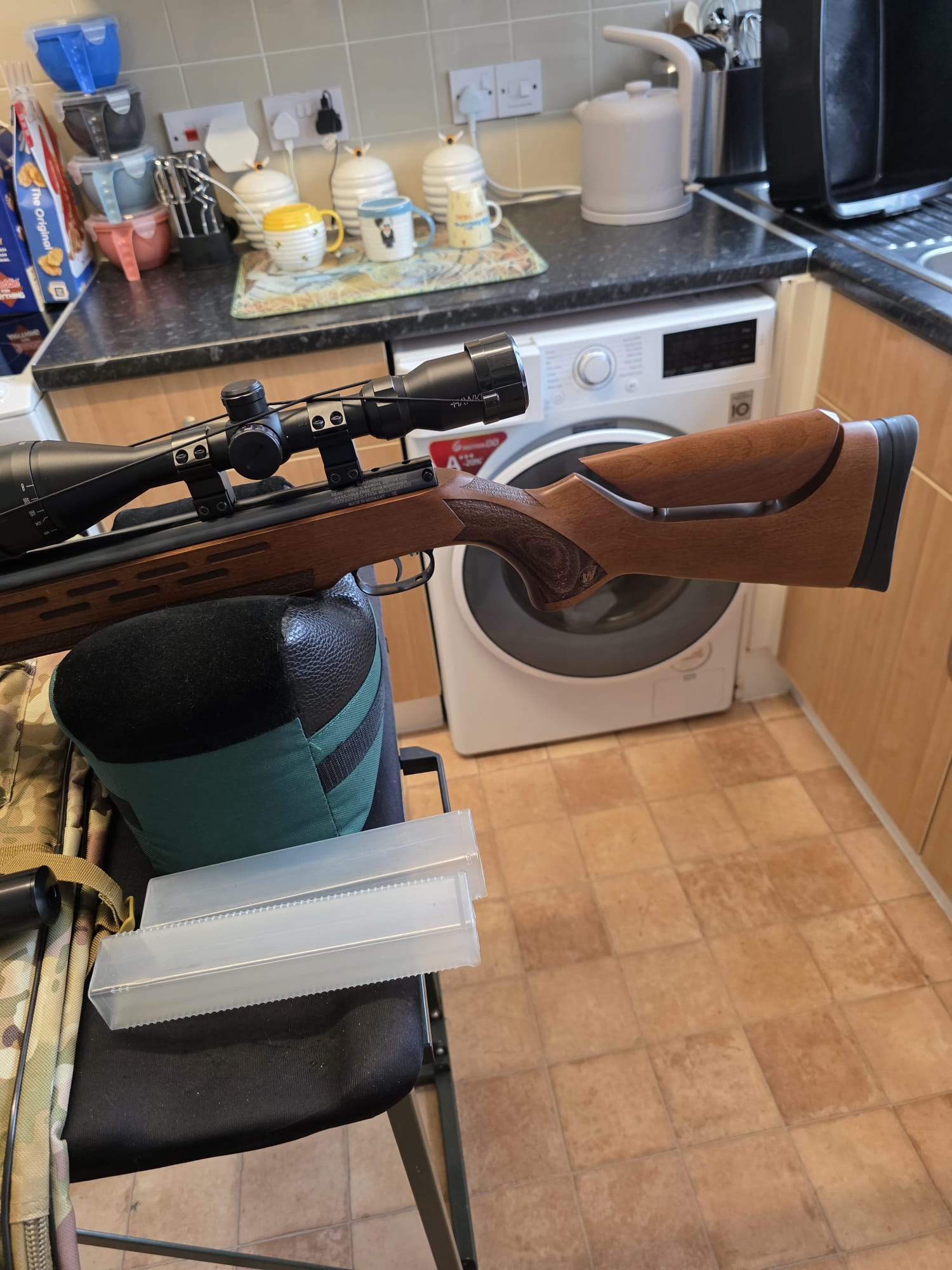 The rifle is in excellent condition with only a couple of very light marks to the seriously eye catching stock. The rifle has been tuned and features an incredibly fast lock time with minimal twang and recoil. The hideous plastic moderator has also been removed and instead features a metal 1/2UNF thread adaptor instead.
