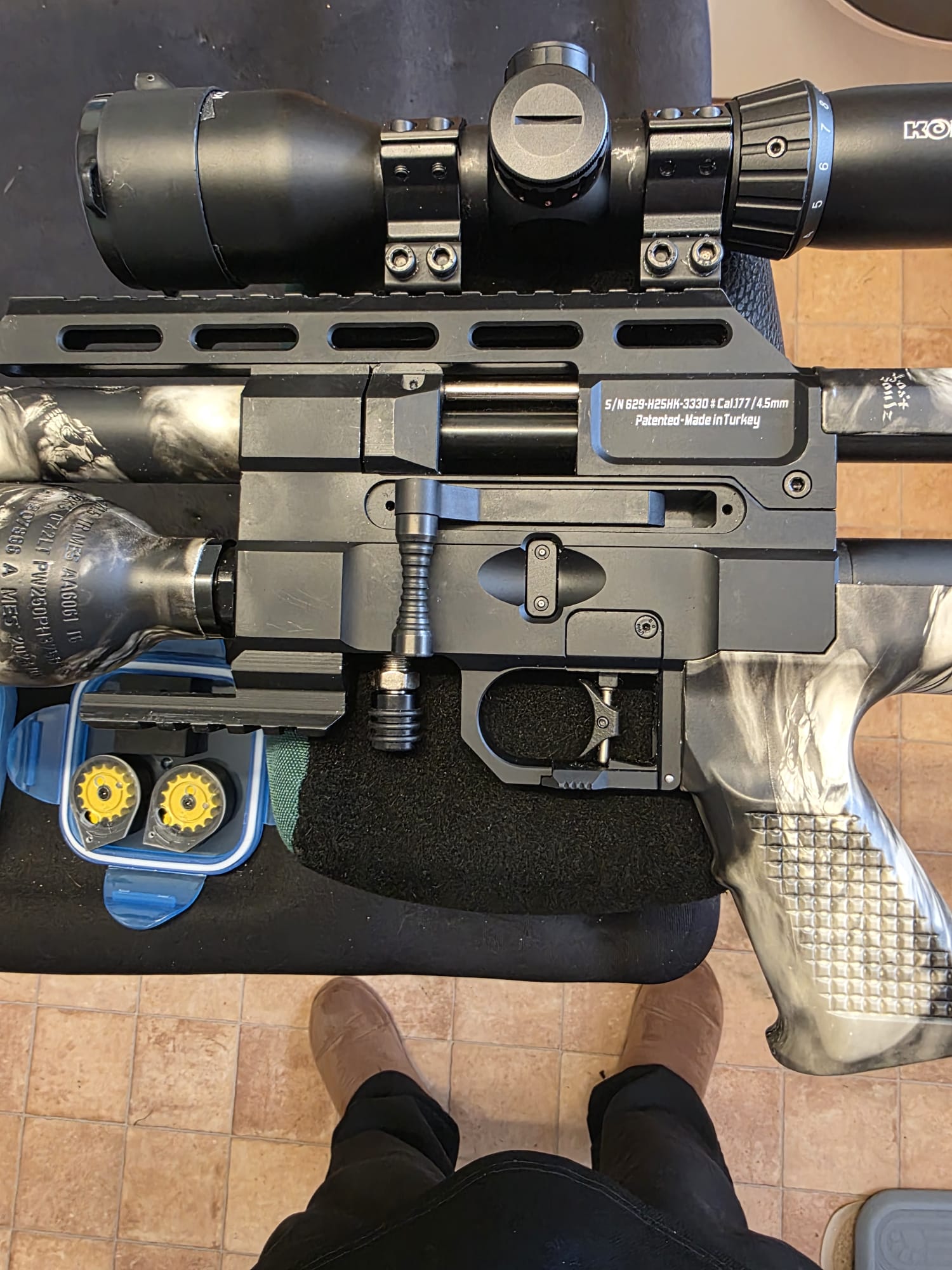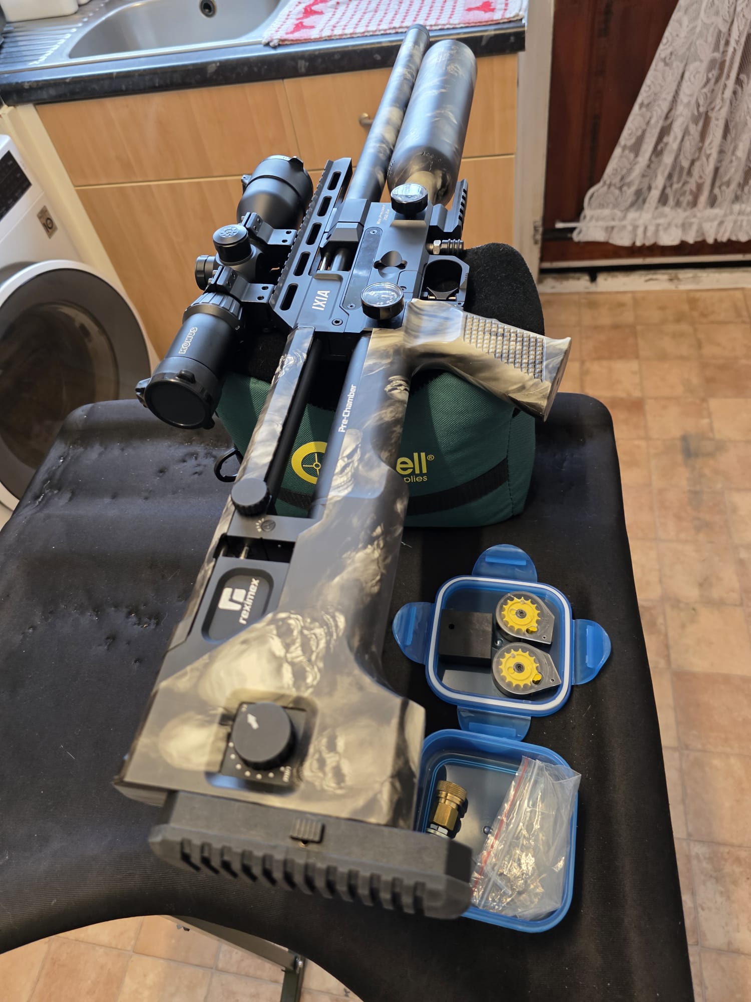 ".22 Ixia Camo, the rifle is in new condition. It also comes with a hard case, two mags, single shot tray, fill probe and a Konus T-30 compact scope."